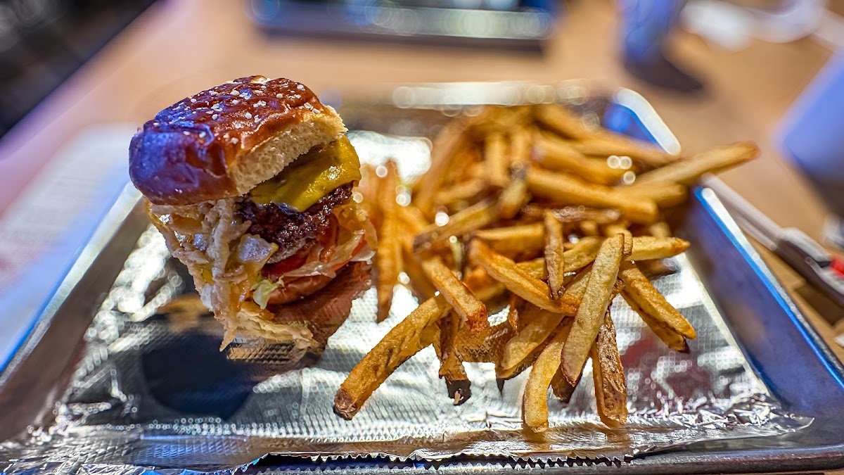 Burgers were excellent but the fries are mediocre— overall very tasty and a large menu with lots of burgers and toppings to customize to your liking and typical prices. I got the “secret menu” onion burger with a personal-size side of fries and it was very good; a little smaller than Five Guys, but filling with all the toppings. I upgraded for $1 to a pretzel bun. Person I went with got the turkey burger and enjoyed it. My meal was about $18, including a fountain drink Some others have described the fries here as soggy — they’re just not crispy enough, combined with being a thicker-style cut (similar to Five Guys but just undercooked in comparison). If I went back, I’d ask they cook mine longer so they’re crispier. I’m not asking for crunchy or burnt, but these need a little something more. Good flavor — they have bags of Idaho potatoes at the front door— but mediocre at best based on how they’re prepared. For example, Wendy’s has a similar cut but they’re crispy, McDonald’s is thinner and crispier, etc. Fries are terrible for you so if I’m gonna blow calories on em, I want them to be worth it I’d like to see a grilled chicken sandwich on the menu — I realize this is a chain brand but adding a little more variety and lower-calorie options to the menu would be nice. For comparison, Smashburger and Habit have grilled options This location is within a shopping plaza with tons of parking and easy access. I drove from Rockland County and it was an easy drive. I went in December but it appears there’s outdoor seating in warmer weather. The staff was friendly and delivered the orders to our table. There’s plenty of seating, the location was clean, they have some TVs and a Coca-Cola fountain along with lemonade and Gold Peak teas. Every table had a bottle of Heinz ketchup and napkins, which was nice. There is a chicken tender sandwich but it’s not actually shown on the in-store menu above the register, which is confusing. Overall enjoyable with some potential for improvement